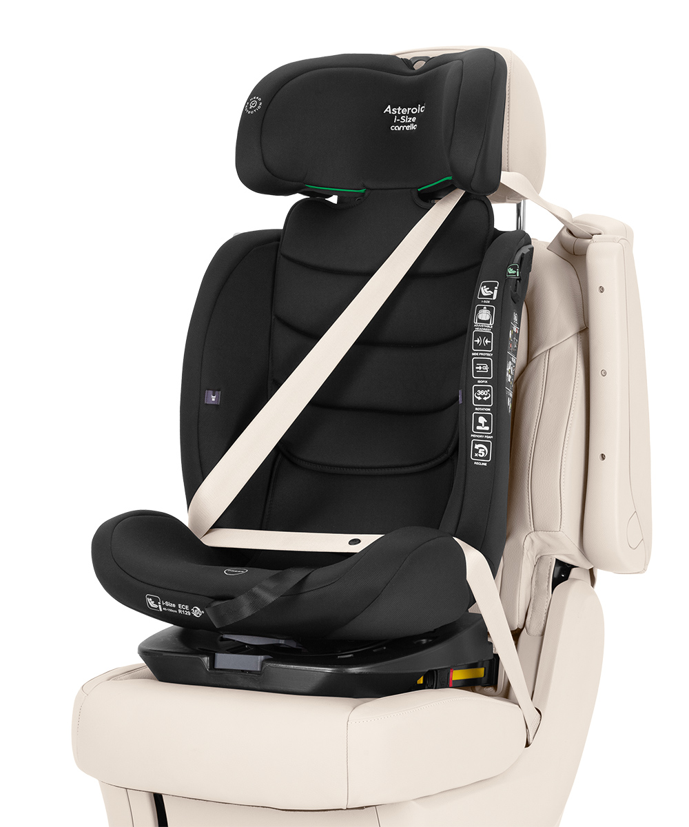 The universal child car seat conforms to the modern I-Size standard. It is equipped with side impact protection, Isofix fastening system, Top Tether (anchor strap) and 360° rotation. Additional seat belt retainer.