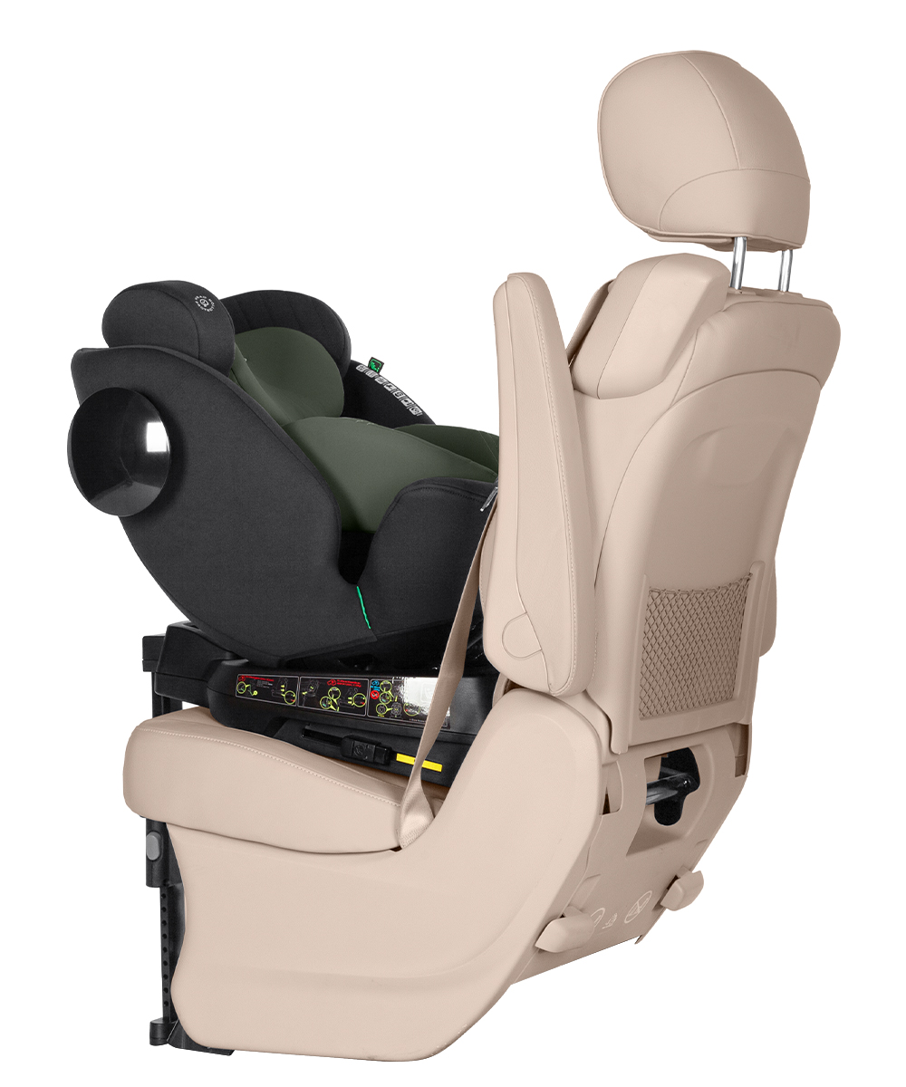 The universal child car seat conforms to the modern I-Size standard. It is equipped with side impact protection, Isofix mounting system, support post and 360° rotation.